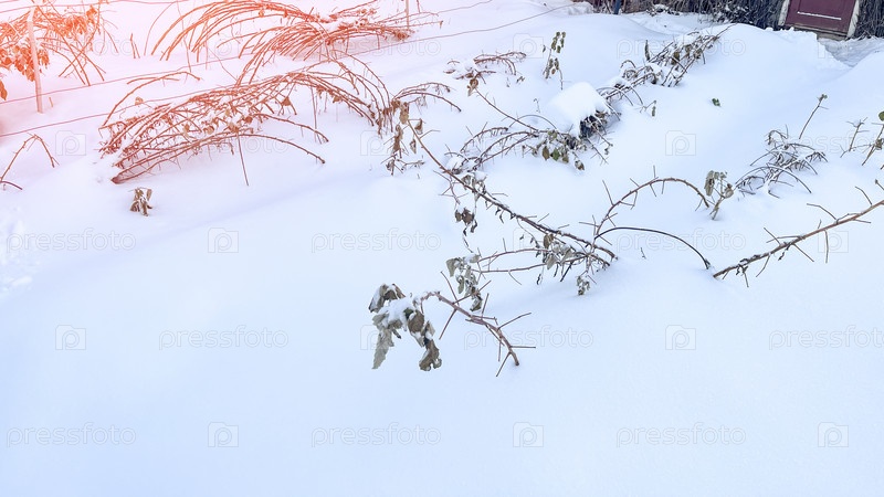 Куст малины зимой в снегу, Ветви кустов зимой пригнутые к земле