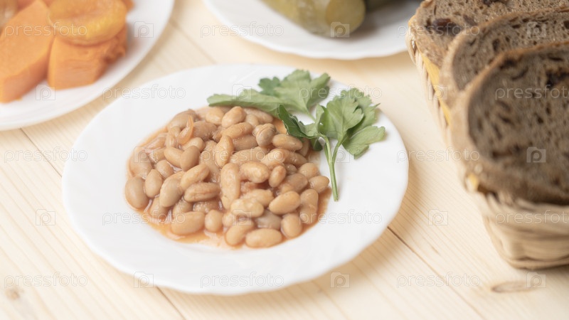 Вареная фасоль в соусе в белой тарелке и кусочек зелени, еда Великого православного поста