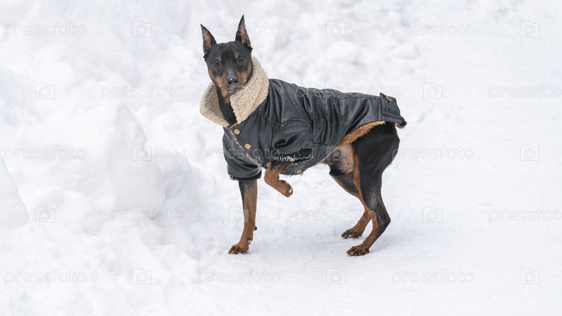 Маленькие собаки в зимней одежде на прогулке зимой