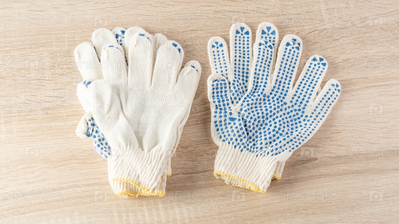 Новые рабочие хлопчатобумажные перчатки на деревянном фоне крупным планом