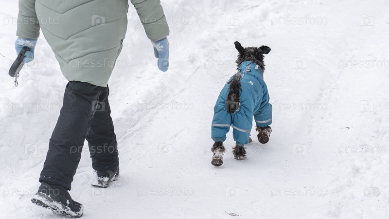 Маленькие собаки в зимней одежде на прогулке зимой, Гладкошерстные карликовые собаки зимой на прогулке с хозяином