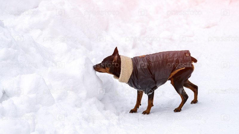 Маленькие собаки в зимней одежде на прогулке зимой