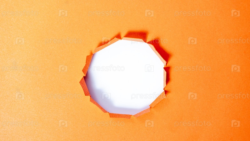 Отверстие в бумажном макете с рваными краями оранжевого цвета для дизайна, гладкий край отверстия, естественный оттенок. Бумага, прокол, отверстие, верхний угол, текстура
