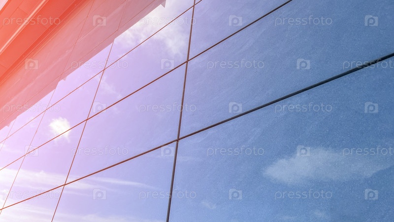 Стена современного здания с отражением облаков, стена гранитного здания с красивым отражением облаков