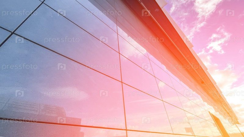 Стена современного здания с отражением облаков, стена гранитного здания с красивым отражением облаков
