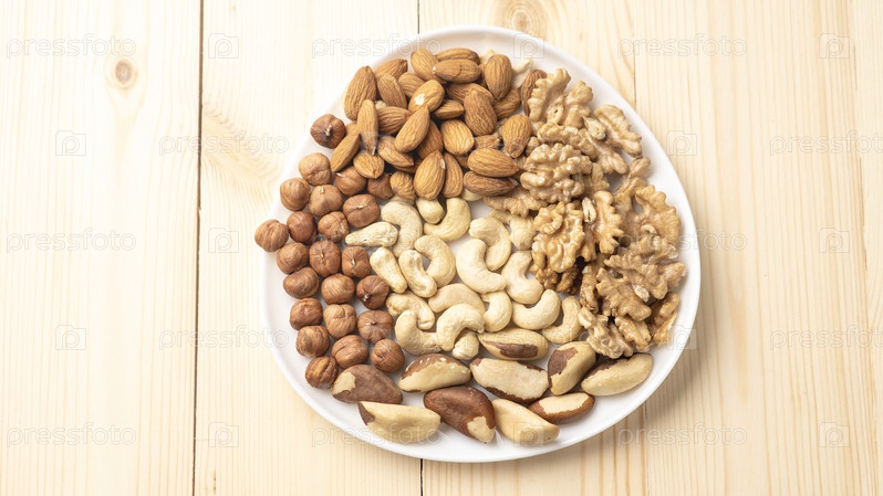 Белая тарелка с орехами на деревянном фоне, ядра грецких орехов, очищенный сушеный фундук, миндаль и кешью, вид сверху, концепция здорового и полезного питания