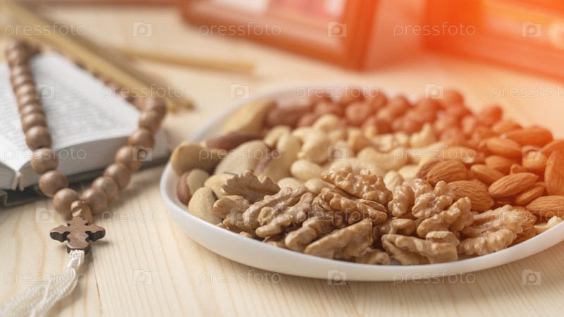 Православная еда, Традиционная еда православных христиан. Орехи. Керамика. Православные четки и иконы на заднем плане