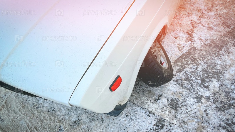 У автомобиля сломано переднее левое колесо. Колесо автомобиля вывернулось от сильного удара, Переднее колесо автомобиля сломалось после наезда на выбоину, Тонированное изображение, Выборочный фокус