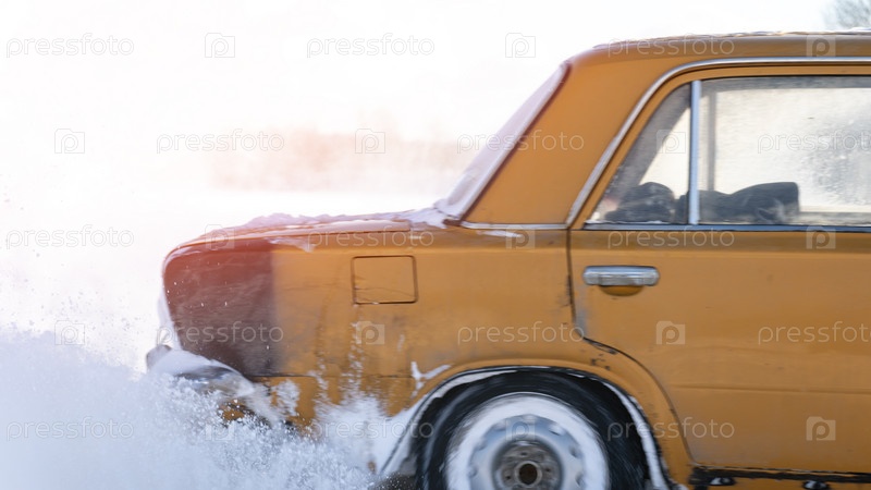 Автомобиль на заснеженной дороге в заносе, скользкая дорога, небезопасное вождение по зимней заснеженной дороге, тонированное изображение с выборочным фокусом, солнечная вспышка