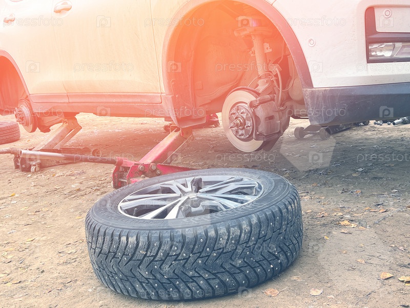 Шиномонтаж замена летней резины, автомобиль на домкратах при замене резины, очередь в шиномонтажных центрах при замене резины лето - зима, погодные условия для зимней резины