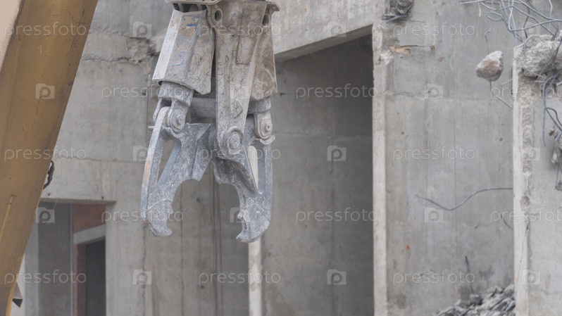 Большой гидравлический кран, демонтаж здания, снос долгостроя. Большой вырубной нож для навесного оборудования для сносных машин, площадок для сноса, строительной промышленности
