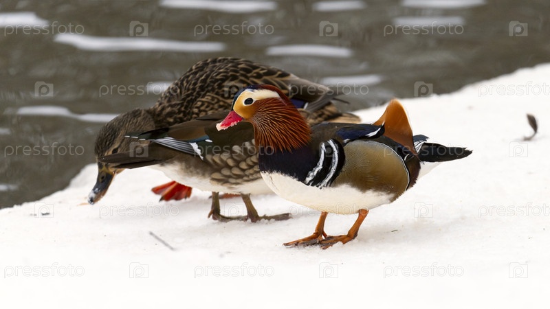 Утка-мандаринка зимой, Утки в снегу крупным планом