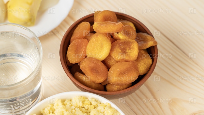 Курага в глиняной чашке, концепция здорового и здорового питания