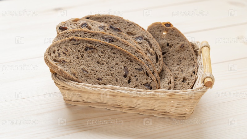 Хлеб в плетеной деревянной тарелке на столе крупным планом. Здоровая еда, хлеб с изюмом из теста