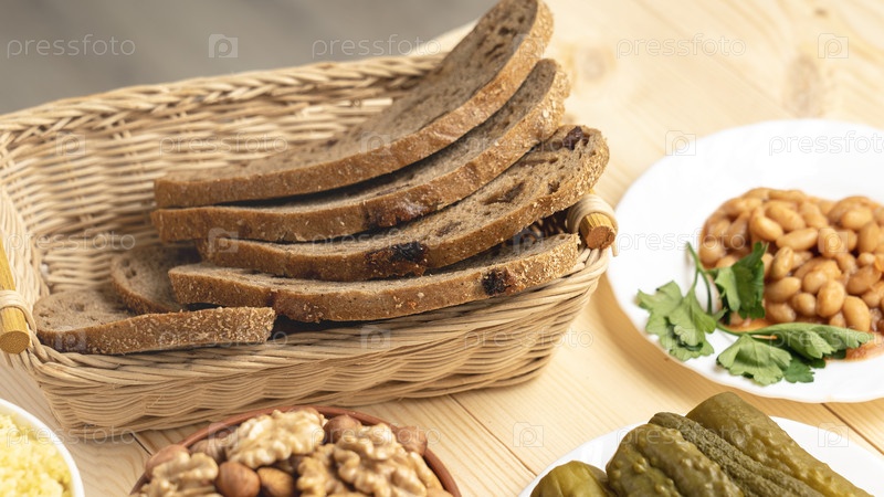 Хлеб в плетеной деревянной тарелке на столе крупным планом. Здоровая еда, хлеб с изюмом из теста