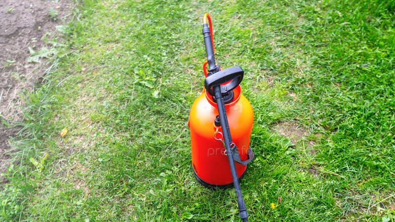 Резервуар для распыления удобрений и химикатов, садовый инструмент для обработки растений от вредителей, крупный план, выборочный фокус, тонированное изображение, вид сбоку