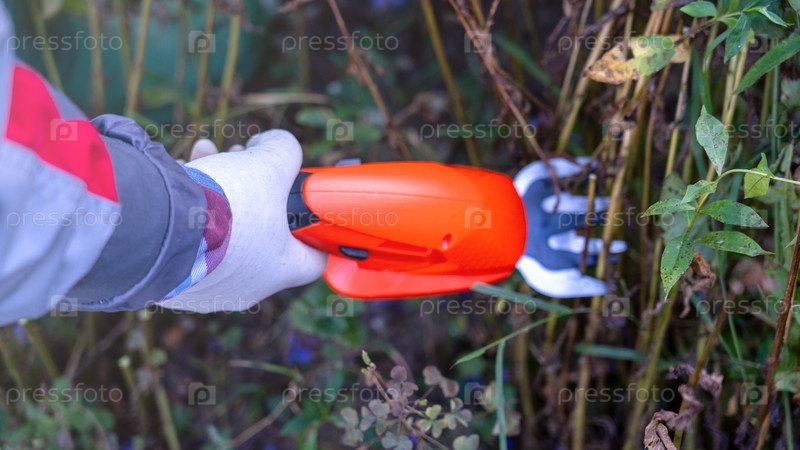 Ручной электрический триммер для кустов крупным планом, рабочий инструмент садовника крупным планом, тонированное изображение, солнечная вспышка, пространство для копирования, уход за садом