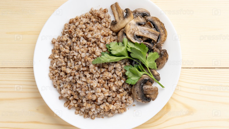 Гречневая каша с отварными грибами, ивовыми травами на деревянном фоне