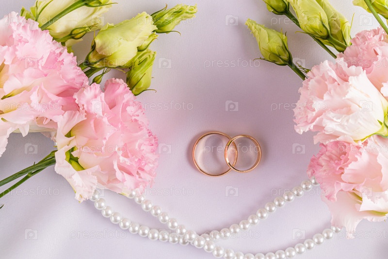Два золотых классических обручальных кольца на белом атласном фоне со свежими розовыми цветами аустомы. Копировальное пространство. открытка. приглашение. крышка