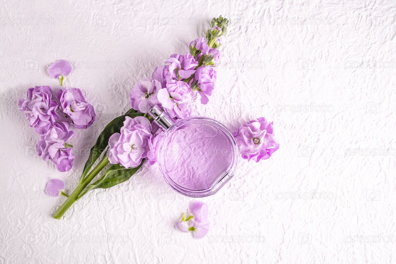 Шикарный круглый флакон с нежным цветочным ароматом лежит на красивом цветке сирени. Вид сверху. Пустой макет продукта. Шаблон упаковки