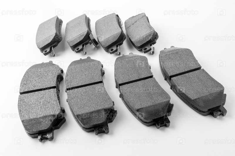 Задние и передние тормозные колодки, тормозные колодки для дисковых тормозов автомобиля на белом фоне