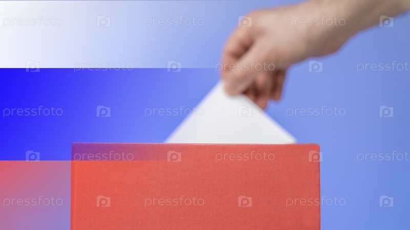 Выборы в России март 2024 г. Выборы Президента Российской Федерации, концепция. Флаг Российской Федерации и урна для голосования крупным планом. Рекламный щит с флагом Российской Федерации и урна для голосования крупным планом