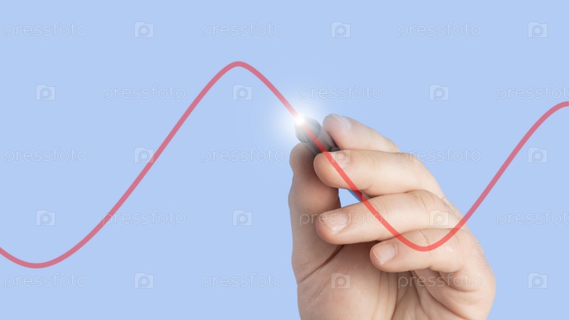 Рука и виртуальный экран с графической параболой На синем фоне концепция роста бизнеса
