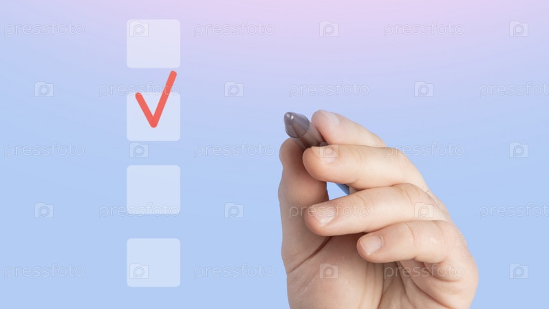 Рука с ручкой и флажком, концепция выбора. Концепция контрольного списка. Бизнесмен использует ноутбук и ставит галочки на виртуальном экране. Проверка разметки флажков