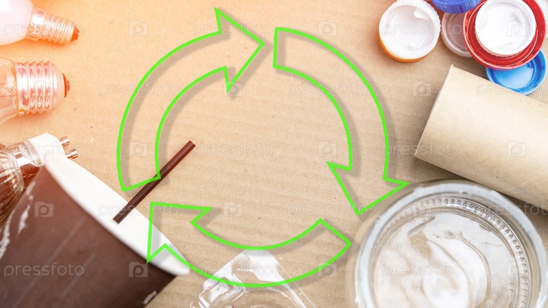 Различные виды перерабатываемых отходов, картонные свалки, пластиковые крышки, стеклянные банки, лампы накаливания, пластиковые контейнеры для пищевых продуктов. Переработка, концепция Eco, знак переработки