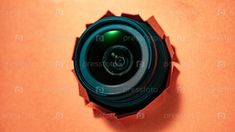 Фотография объекта через порванный лист бумаги, красный порванный бумажный картон внутри дырчатого объектива, фотоаппарат, таблоидная пресса. В поисках сюжета для фотостоков
