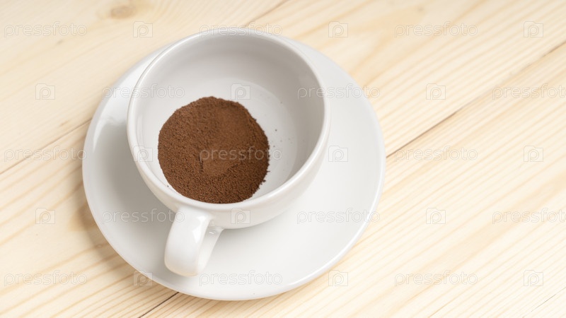 Сублимированный кофе, растворимый кофе в белой чашке на деревянном фоне, вид сверху