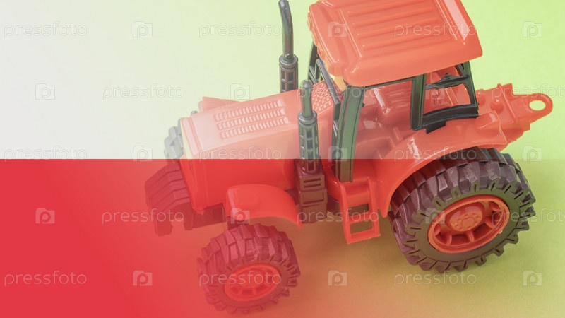 Фермерские протесты в Польше. Красный игрушечный трактор на зеленом фоне, выборочный фокус, концепция сельского хозяйства