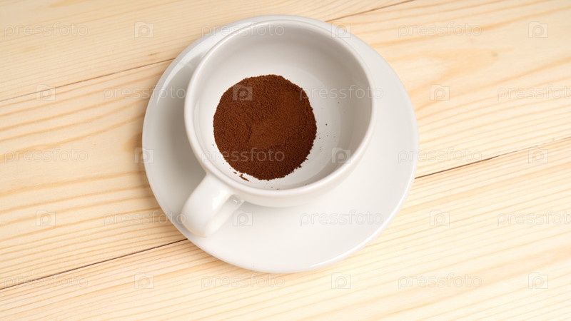 Сублимированный кофе, растворимый кофе, налитый в чашку, на деревянном фоне, вид сверху