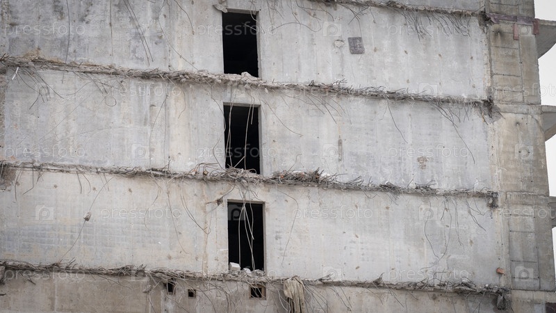 Частично снесенное здание крупным планом, банкротство строительных фирм, обманутые дольщики долевого строительства, выборочный фокус тонированного изображения