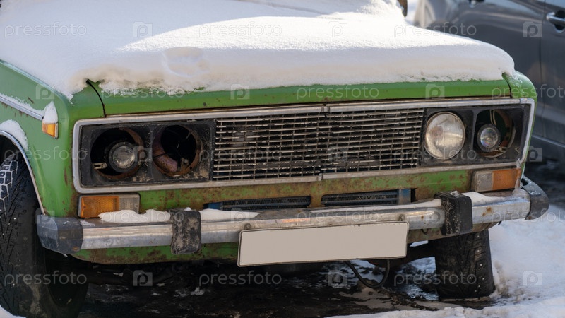 Старые автомобили под снегом, машина на стоянке была покрыта снегом зимой