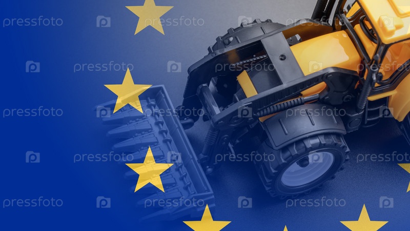 Желтый трактор на белом фоне, флаг Европейского союза, концепция посадки фермеров. Трактор и флаг Европейского Союза. Крупный план сверху