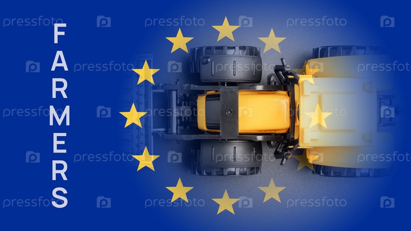 Желтый трактор Флаг Европейского Союза, концепция. Фермерский кризис в Евросоюзе