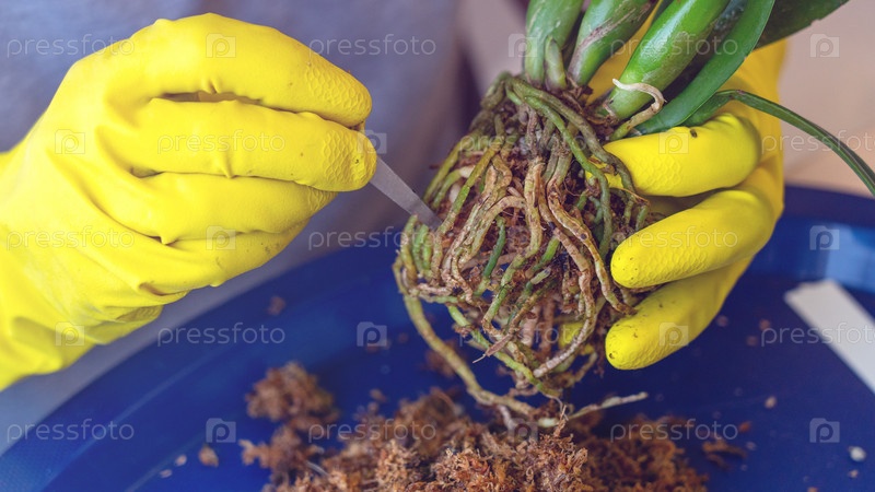 Пересадка орхидеи, женщина пересаживает комнатные растения, за комнатными растениями легко ухаживать, красивое растение орхидеи пересажено в новую почву из сосновой коры на фоне деревянного стола