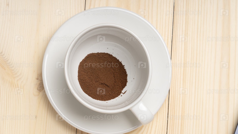 Сублимированный кофе, растворимый кофе в белой чашке на деревянном фоне, вид сверху