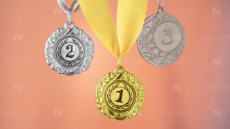 Спортивные медали, награды за достижения в спорте, крупный план, золотая, серебряная и бронзовая медаль