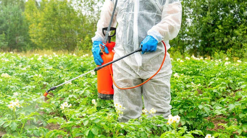 Защита растений от вредителей и болезней. Мужчина в белом защитном костюме обрабатывает растения из распылителя