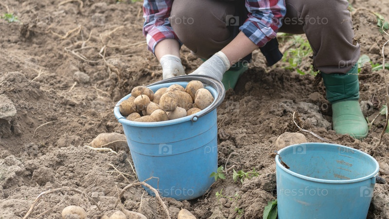 Сбор картофеля вручную, женщина, собирающая картофель руками в поле, ручной труд в сельском хозяйстве