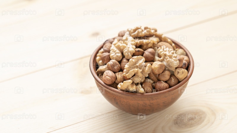 Смешанные орехи в глиняной чашке на деревянном столе, ядра грецких орехов, очищенный сушеный фундук, миндаль и кешью, вид сверху, концепция здорового и полезного питания