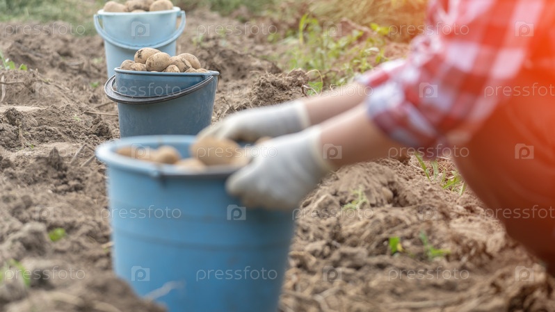 Сбор картофеля вручную, женщина, собирающая картофель руками в поле, ручной труд в сельском хозяйстве