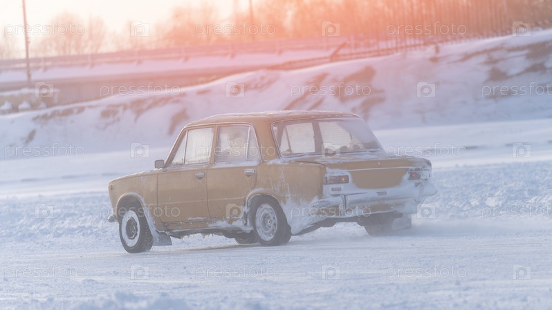 Автомобиль на заснеженной дороге в заносе, скользкая дорога, небезопасное вождение по зимней заснеженной дороге, тонированное изображение с выборочным фокусом, солнечная вспышка
