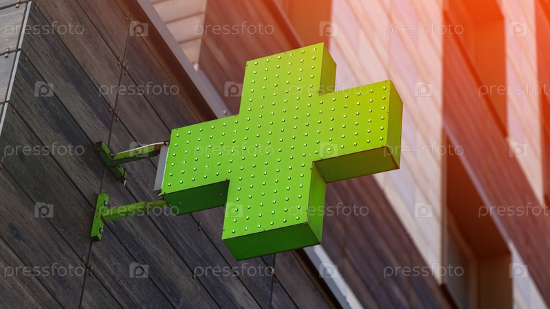 Аптека под знаком Зеленого Креста. Вывеска аптеки на фасаде здания в жилом районе