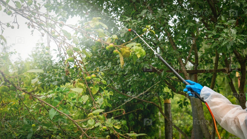 Фермер обрабатывает пестицидами против вредителей фруктовые деревья в саду, груши, яблони и другие фруктовые деревья