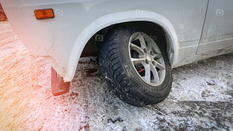 Выверну колесо от наезда на препятствие на зимней дороге. Колесо автомобиля вывернулось от сильного удара, Переднее колесо автомобиля сломалось после наезда на выбоину, Тонированное изображение, Выборочный фокус