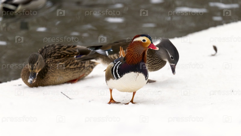 Утка-мандаринка зимой, Утки в снегу крупным планом