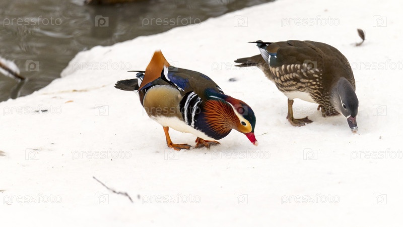 Утка-мандаринка зимой, Утки в снегу крупным планом